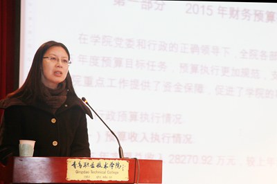 1月18日,学院在艺术厅召开四届四次教代会、三届三次工代会全体会议,会议听取讨论了院长覃川所作的《院长工作报告》、副院长邢广陆所作的《2015年财务决算和2016年财务预算报告说明》,与会代表提出了意见和建议;在大会主席团扩大会议上,各代表团团长汇报了分组讨论情况和代表们提出的意见和建议,并审议通过大会决议(草案);大会以举手表决方式通过了关于《院长工作报告》的决议、关于《2015年财务决算和2016年财务预算报告》的决议。
