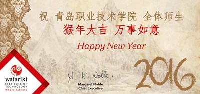 我谨代表新西兰怀卡托理工学院感谢贵校2015年给予的支持,期待两校新的一年更紧密的合作。预祝春节快乐!