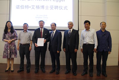 作为中德两国城市间友好交流的积极推进者,2014年4月,诺伯特•埃格博士与院长覃川在青岛进行了首次会晤,就我院与德国巴登符腾堡(州)双元制应用技术大学开展合作与交流的多项议题进行了深入洽谈,并于同年8月见证了两校合作与交流协议的签署仪式。2015年6月10日,埃格博士受聘为我院客座教授,并为我院师生作《友好城市关系框架下的中德两国高校间合作的经验和可能性》专题讲座。2015年10月12日至14日,院长覃川率团访问德国巴登符腾堡(曼海姆)双元技术大学时,埃格博士热情接待了来访团一行并对我院发展寄予美好祝愿。