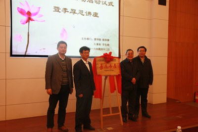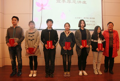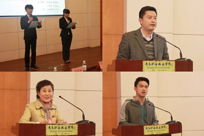一年一度,共赴阅读盛宴;几载春秋,同沐心灵洗礼。在4.23世界读书日即将到来之际,在我院“阅读工程”切实推进之时,4月12日下午,学院在报告厅开展“4月读书月活动启动仪式暨李厚恩讲座”活动。活动由图书馆、组织部、人事处、学生处共同举办,院长覃川、副院长孔宪思、青岛市社科联科普部负责人李厚恩、黄岛区法院研究室主任崔家远出席活动,活动由图书馆馆长王文中主持。 活动共分为两个阶段。第一阶段的读书月活动启动仪式在古筝弹奏《雪山春晓》的优美旋律中开场,“清心读书社”学生代表吴晓艳、“院长荣誉班”学生代表张天姿共同宣读了《2016年读书月倡议书》;干部代表、商学院党总支书记田旺军,教师代表、旅游学院邵红教授,学生代表、酒店管理专业2014级桂周同学发表了读书感言;青岛市社科联科普部负责人李厚恩、副院长孔宪思、组织部部长孙振超、商学院党总支书记田旺军共同为“有道书屋”揭牌;人事处处长姜福金为2015年教师“读书之星”颁发证书;学生处处长赵悦为2015年学生“读书之星”颁发证书,活动在清新的民谣弹唱中结束。 第二阶段的活动中,李厚恩为学院师生作《从李毓昌、左懋第等看历代青岛士子的家国情怀》讲座。他从士人左懋第和李毓昌的家国情怀、历代青岛士人的价值追求和人生选择、为什么要大力倡导家国情怀3个方面进行了精彩讲解。旁征博引、娓娓道来,令现场听众受益匪浅。 活动期间,图书馆还同时举办了“青职好书推荐”和“好书中的好书--2015年好书榜精选书目推荐”两个展览。4月读书月期间,图书馆、组织部、人事处、学生处将共同组织以“幸福校园,快乐阅读,精彩无限”为主题的多元化阅读推广活动,为全院师生带来丰富的精神食粮,将读书月融入青职的文化与理念,让师生因读书而眼明心净,让校园因读书而充满诗意。