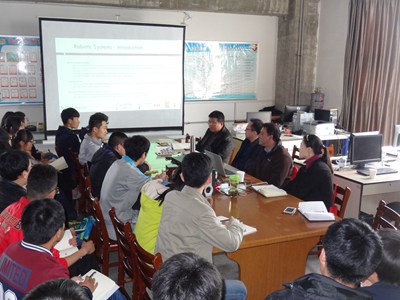 交流中,努诺.费雷拉教授给海尔学院工业机器人团队教师介绍了科因布拉理工学院的基本情况,重点展示了科因布拉理工学院的在机器人方面的研究情况以及他个人所从事的研究领域。双方还就学生互访交流等下一步合作进行了探讨。努诺.费雷拉教授还深入浅出地给实验室学生介绍了机器人方面的基础知识,之后介绍了科因布拉理工学院,同时就同学们感兴趣的有关留学科因布拉理工学院等问题进行了解答。