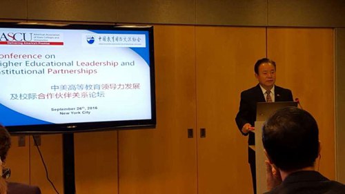26日,代表团还赴美国参加了中美高校校长领导力发展及合作论坛。论坛上,中国高职教育代表团团长、中国教育国际交流协会副秘书长宗瓦,介绍了中国百千万项目推进情况,中美双方就百千万国际合作教育项目取得的前期成果进行了总结,分享了参与院校的经验,并就下一步深入合作进行了交流。会议期间,覃川与我院的合作院校——纽约州立大学科贝尔斯基尔农业与技术学院院长马里恩.泰伦齐奥女士进行了简短的会晤,就今后做好计算机“3+2”专业人才培养,加强双边沟通、合作交换了意见。