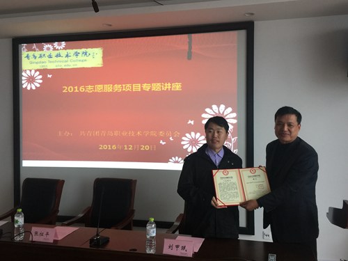 讲座开始前,青岛市志愿服务学院常务副院长于水善宣读了聘任决定,刘甲珉向张祖平颁发了聘书。