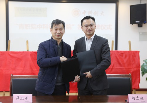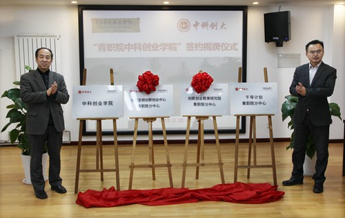 薛玉平与刘志强作为双方代表签署了《维多利亚vic003与北京中科创大创业教育投资管理有限公司共同创办维多利亚vic003中科创业学院合作协议书》。覃川和刘志强共同为“青职院中科创业学院”“千导计划青职院分中心”“中国发明创新创业中心青职院分中心”“创新创业教育研究院青职院分中心”揭牌。