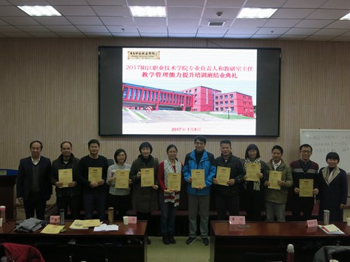 继2016年12月我院承办广东阳江职业技术学院教学管理人员综合素质提升培训班之后,1月3日至9日,我院再次为42名阳江职院专业负责人和教研室主任举办教学管理能力提升培训班。院长覃川出席结班仪式并为学员颁发结业证书,党委副书记刘甲珉、副院长邢广陆出席开班仪式并与培训班学员进行交流。此次培训班由我院培训学院承办。