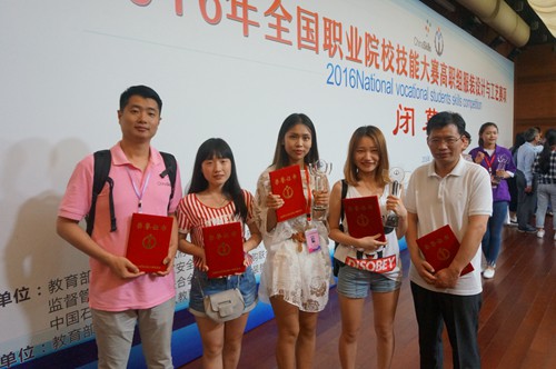 贺文玲同学(左二)获服装制版与工艺分赛项一等奖;王盈力同学(左三)获服装设计