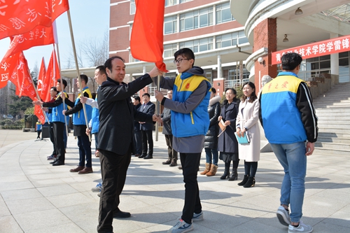 覃川向各二级学院志愿服务队授旗,号召全院学生用实际行动践行雷锋精神,传播“奉献、友爱、互助、进步”的志愿精神。