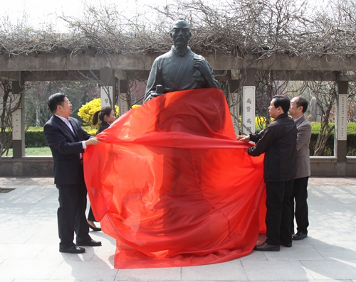 党委书记王金生、院长覃川、中国墨子学会副会长王凯、院学生会副主席张慧娟共同为墨子像揭幕