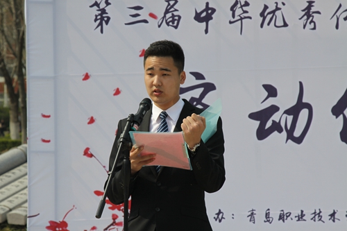 院学生会副主席任华新宣读“传承中华优秀传统文化,做文明有礼的青职人”倡议书