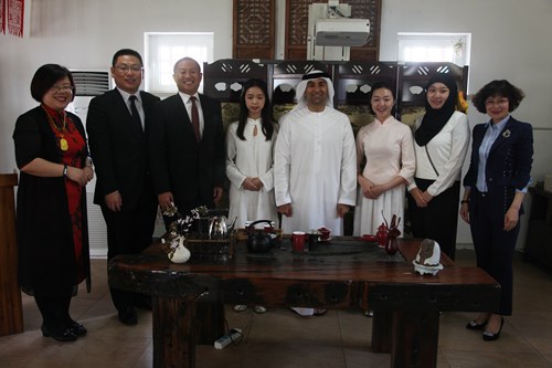 迪拜客人在海草房茶艺室观看茗轩队社团学生的茶艺表演