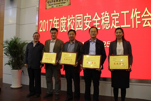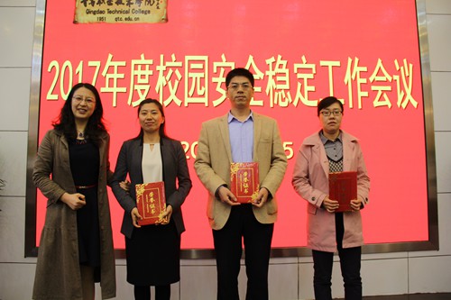 会上,副院长薛玉平作2016年度学院安全稳定工作总结报告;党委书记王金生、院长覃川分别与各二级学院签订了2017年度部门安全稳定责任书和消防安全责任书;副院长孔宪思、邢广陆分别为学院2016年度维稳先进集体和个人颁奖。生物与化工学院、信息学院、旅游学院、培训学院获得维稳先进集体荣誉称号;邵凯、杨春旺等38人获得维稳先进个人荣誉称号。先进集体和先进个人代表旅游学院党总支副书记刘丹和公寓管理中心丁洁分别在会上发言。