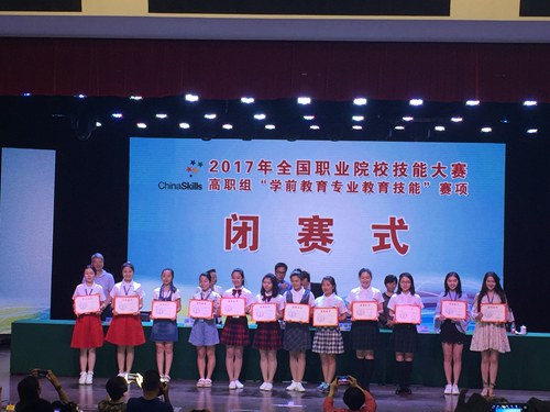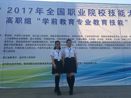 5月18日至19日,由教育部主办的2017年全国职业院校技能大赛高职组“学前教育专业教育技能”赛项在浙江省金华职业技术学院举行。大赛共有来自全国29个省市(自治区)的56所高校代表队、112名选手参赛,其中有30个代表队为幼儿师范高等专科学校。经过紧张激烈的角逐,由我院教育学院2014级郭雯玥、霍晨曦两名同学组成的代表队,以总分第8名的成绩获得团体二等奖。