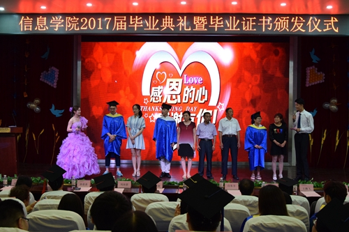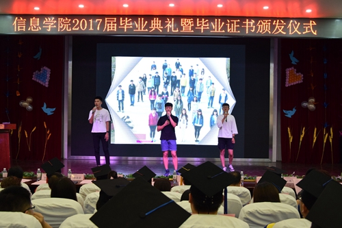 6月26日下午,信息学院在艺术厅举办2017届毕业生毕业典礼暨毕业证书颁发仪式。院长覃川、党委副书记刘甲珉出席典礼,宣传部、学生处负责人及信息学院相关人员参加典礼,企业来宾及部分毕业生家长代表应邀观礼。