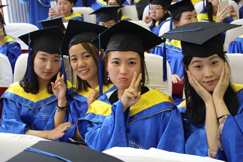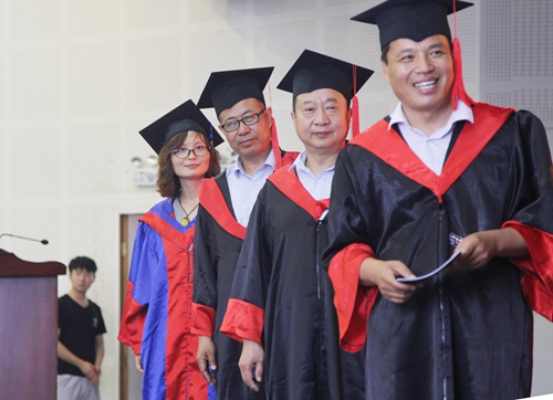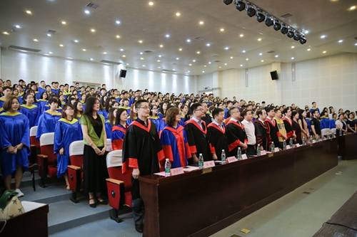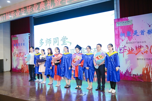 毕业典礼在雄壮的国歌声中拉开序幕,全体毕业生观看了毕业生电子相册,一起回顾三年的成长历程。接下来,商学院党总支书记刘建东宣读了《商学院关于2017届省级优秀毕业生评选结果的通报》,刘甲珉、商学院院长杨明、青岛垦荒人总经理王雷、青岛商至信网络科技有限公司人资部经理薛萌为38名省级优秀毕业生颁发证书和纪念品。
