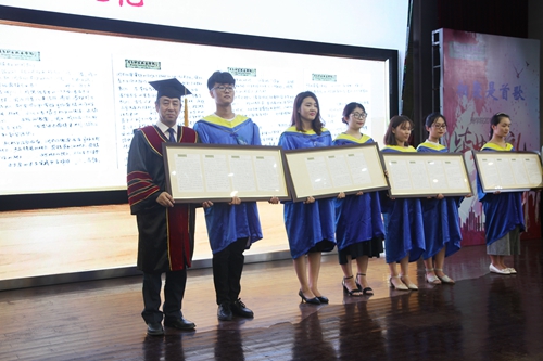 在全体嘉宾、家长的共同见证下,杨明为毕业生拨穗,覃川为商学院毕业生颁发毕业证书并一一合影留念,刘甲珉为全体毕业生赠送《毕业生纪念册》,教师代表与毕业生握手送别。典礼在温馨的祝福与掌声中圆满落下帷幕。