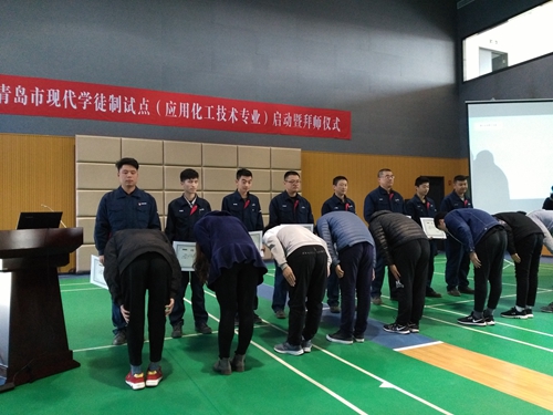 11月24日,青岛市现代学徒制试点(应用化工技术专业)启动暨拜师仪式在青岛海湾化学有限公司(以下简称青岛海湾化学)举行。青岛海湾化学企业导师、我院副院长孔宪思,青岛海湾集团有限公司(以下简称青岛海湾集团)副总经理黄虎林,青岛海湾化学党委书记、董事长邹铁军出席仪式,企业相关部门负责人、我院生物与化工学院相关负责人及40名试点班学生参加了仪式。仪式由青岛海湾集团人力资源部副部长盖玉晓主持。