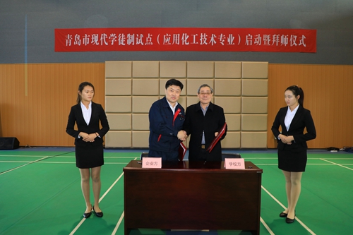仪式上,孔宪思、邹铁军代表校企双方签订了现代学徒制协议,生物与化工学院院长吕海金宣读了关于聘请青岛海湾化学苏秀龙等8位企业导师的决定,校企双方领导为企业导师颁发了聘书,并举行了拜师仪式。