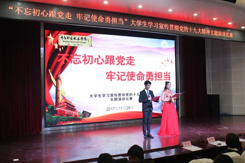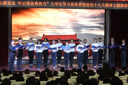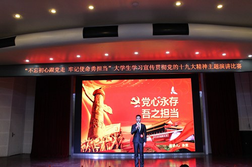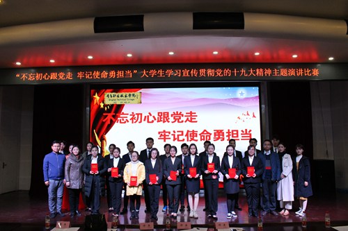 11月28日,学院在艺术厅举办了“不忘初心跟党走、牢记使命勇担当”大学生学习宣传贯彻党的十九大精神主题演讲比赛,学院党委宣传部、思政部、团委等部门老师参加本次活动并担任评委,各二级学院师生代表共400余人观看了比赛。