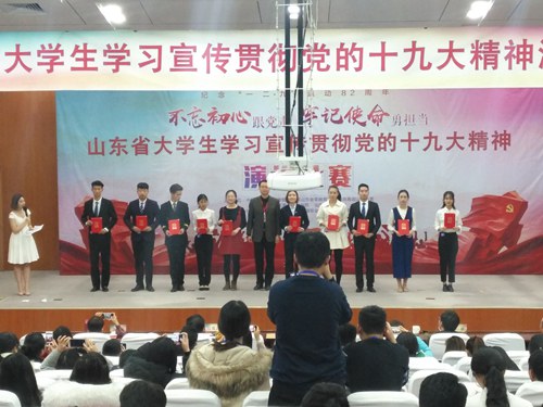近日,“不忘初心跟党走,牢记使命勇担当”山东省大学生学习宣传贯彻党的十九大精神演讲比赛在山东济南落下帷幕。商学院2017级市场营销1班孙策同学代表学院参加比赛,最终取得大赛优秀奖。