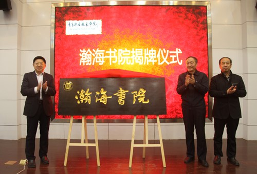 中华全国总工会副主席、我院客座教授许振超与党委书记王金生、院长覃川共同为瀚海书院揭牌