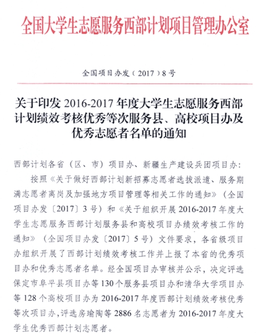 近日,团中央发文,表彰了2016-2017年度西部计划优秀项目办,我院作为省内唯一高职院校位列其中,也是我市唯一的获评单位。