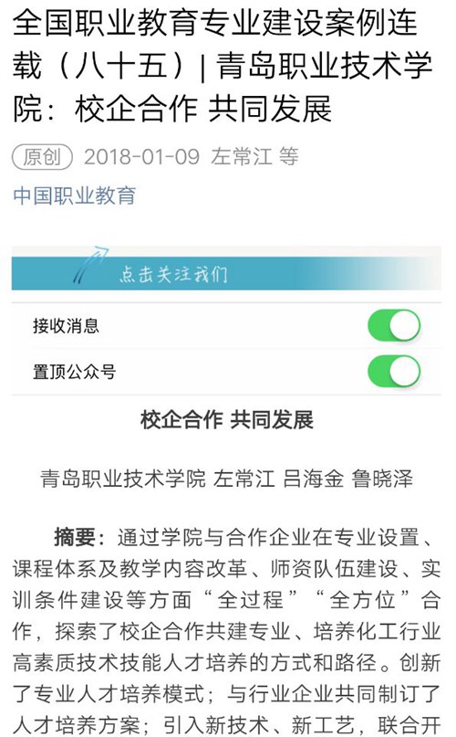 中国职业教育官方微信公众号推送我院入选案例