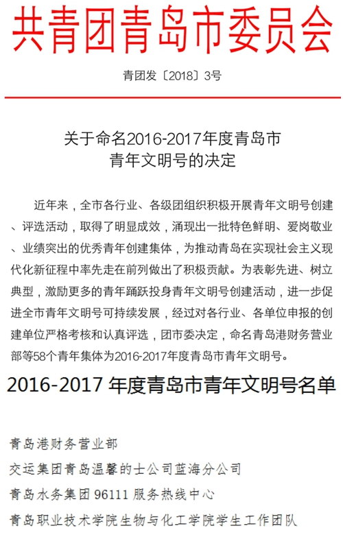 1月15日,共青团青岛市委发布《关于命名2016-2017年度青岛市青年文明号的决定》文件,我院生物与化工学院学工团队被正式确定为“2016-2017年度青岛市青年文明号”。