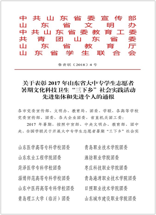 日前,山东团省委、省学联联合省委宣传部、省文明办、省委教育工委、省教育厅开展了2017年山东省大中专学生志愿者暑期文化科技卫生“三下乡”社会实践活动通报工作,对在2017年“三下乡”社会实践活动中表现优秀,成绩突出的单位、团队和个人进行了表彰。我院团委荣获2017年山东省大中专学生志愿者暑期“三下乡”社会实践活动优秀组织单位称号,同时获评1支山东省重点团队,4支优秀服务团队,8名优秀学生和3名优秀指导教师。