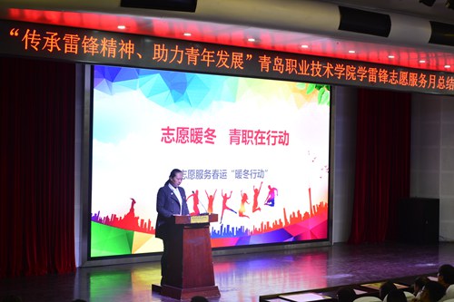 党委书记王金生在总结表彰大会上讲话。他首先代表党委向积极参与文明校园建设、投身志愿服务工作的全院师生表示衷心的感谢和诚挚的敬意,向受到表彰的志愿者集体、项目和个人表示热烈的祝贺。在讲话中,结合工作实际,王金生就进一步建立完善参与广泛、形式多样、活动经常、机制健全的志愿服务体系,推进“学雷锋”活动专业化、品牌化、社会化发展提出三点意见:一是提高认识,不断扩大志愿服务的参与面和影响力;二是营造氛围,着力增强志愿服务的育人功效;三是完善机制,扎实推进志愿服务常态化开展。他强调,要形成“党委领导、团委统筹、二级学院联动、部门协动、全院参与、合力推进”的志愿服务工作格局;要形成“上下贯通、条块结合”的志愿服务队伍格局和一茬接一茬、驰而不息抓落实的接力机制。最后,他号召全院师生积极行动起来,以志愿服务点赞雷锋精神,以实际行动书写雷锋故事,走好新时代的志愿服务长征路,让雷锋精神长驻校园,永存心间。