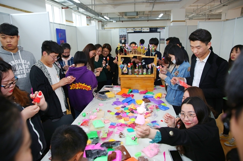 文创市集上,手工制作的扎染、版画、陶瓷以及充满儿时回忆的泥老虎等全部为艺术学院师生原创,每一件作品都独具匠心,饱含深意,展现了同学们极强的动手能力、想象力和创造力。一个个融合了中国传统文化的摊位,通过一系列创意作品展示,引导同学们用创新的视角欣赏与众不同的传统文化之美。市集的摊位全部以创意作品展示为主、互动性游戏为辅,现场的版画体验人气爆棚,扎染、陶瓷等展位也是门庭若市。活动当天还邀请到传统技艺传承人在十二楼展厅与同学们共同体验剪纸、软陶、捏面人等一系列手作。