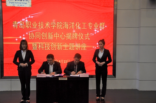 4月13日,学院在报告厅举行海洋化工专业群协同创新中心揭牌仪式暨科技创新主题讲座活动。青岛明月海藻集团有限公司、青岛惠城环保科技股份有限公司、青岛君康检测评价有限公司、青岛中核旺泰涂料有限公司、青岛兴国涂料有限公司等5家企业代表,学院副院长薛玉平,科技处处长薛红燕,生物与化工学院负责人、老师及学生代表参加了揭牌仪式。