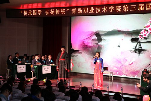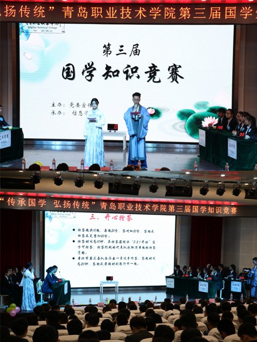 经过前期初赛选拔,各二级学院分别派出一支代表队参加决赛。比赛在歌曲《但愿人长久》中拉开帷幕。决赛共分为5个环节,首先是个人必答题,每支队伍分别派出两名选手依次回答相应问题,此轮各学院实力相当,比分不相上下;第二环节是快速问答题,每位选手需要在60秒内尽可能多地答对题目,此环节使比分逐渐拉开距离;第三环节是开心抢答题,选手之间比拼手速进行抢答,场上紧张激烈的氛围将比赛推向高潮;第四环节为观众互动题,每支队伍的后援团表现毫不逊色,竞相抢答;第五环节为风险闯关题,选手们可自由选择30、50、80分的题目作答。比赛现场,选手们沉着应答,带领观众穿越古今,领略了大好河山之美,游子思乡之情,赛出了风采,同时也传播了国学经典知识。经过激烈角逐,最终旅游学院代表队拔得头筹,商学院代表队、艺术学院代表队荣获二等奖,信息学院代表队、海尔学院代表队、生化学院代表队、教育学院代表队荣获三等奖。比赛在歌曲《声律启蒙》中圆满落幕。