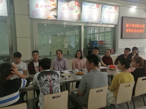 6月18日上午,院长覃川在后勤服务中心、学生处相关负责人的陪同下,在学院海悦厅教工食堂与来自7个二级学院的20多名学生一同参加了由后勤服务中心组织开展的“端午飘香‘粽’是情,青职陪你过端午”主题活动。