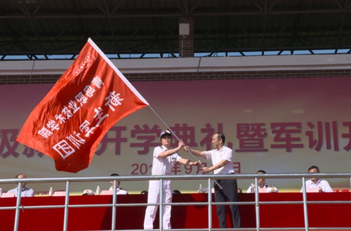 仪式由党委副书记刘甲珉主持。仪式中,首届山东省青年技能名师、山东省“富民兴鲁”劳动奖章获得者、海信学院副教授刘阳和全国职业院校技能大赛导游服务赛项冠军获得者、旅游学院旅游管理专业2016级学生丁麟分别代表教师和在校生发言。院长覃川向2018级新生军训团团长王鑫授旗。随后,承训教官进行了精彩的队列示范表演。我院2018级新生代表赵庆安带领全体新生进行军训宣誓。