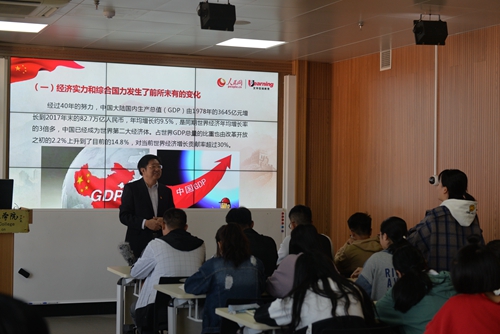 课堂上,王金生通过丰富的实例,以生动的语言,深入浅出地向同学们全面介绍了改革开放的历史背景、历程、取得的巨大成就、经验启示以及新时代建设等五个方面的内容,使同学们更加深入透彻的理解了中国共产党带领人民坚持改革开放不动摇的意志,坚定了同学们学好本领投身中华民族伟大复兴事业的信念。他要求学生通过《形势与政策》课与老师形成学习共同体,他勉励同学们认真学习,积极参与,把思政课堂打造成为师生深入沟通交流的平台,通过课程了解国内外形势,感受国家改革开放40年来的巨大变化。此次形势与政策课,授课内容丰富、思想深刻、逻辑严谨、层次清晰,既是一次充满激情和感召力思想政治教育课,一堂思政课教学示范课,也是一节激发学生投身中国特色社会主义伟大建设事业的动员课。