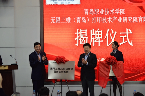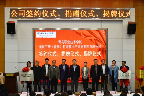 会上,王金生与罗军共同为“无限三维3D打印技术创新实训基地”“教师研修基地、学生实训基地”“大学生创新创业实践基地”揭牌。覃川与罗军共同为无限三维(青岛)打印技术产业研究院有限公司捐赠我院的30台3D打印桌面机剪彩,并为罗军颁发了捐赠证书。薛玉平与罗军签订校企合作协议。
