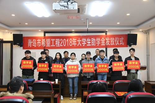 12月13日,2018年青岛市希望工程大学生助学金发放仪式在学院举行。党委副书记刘甲珉、共青团青岛市委副书记韩昌丽、青岛天拓世纪广告设计制作有限公司副总经理姜刚、共青团西海岸区委副书记于海鹏,各院系党、团总支书记、辅导员代表与受资助学生出席仪式。与会领导和嘉宾为30名受资助大学生每人发放2000元“2018青岛市希望工程大学生助学金”。仪式由学院团委书记张旭鹏主持。