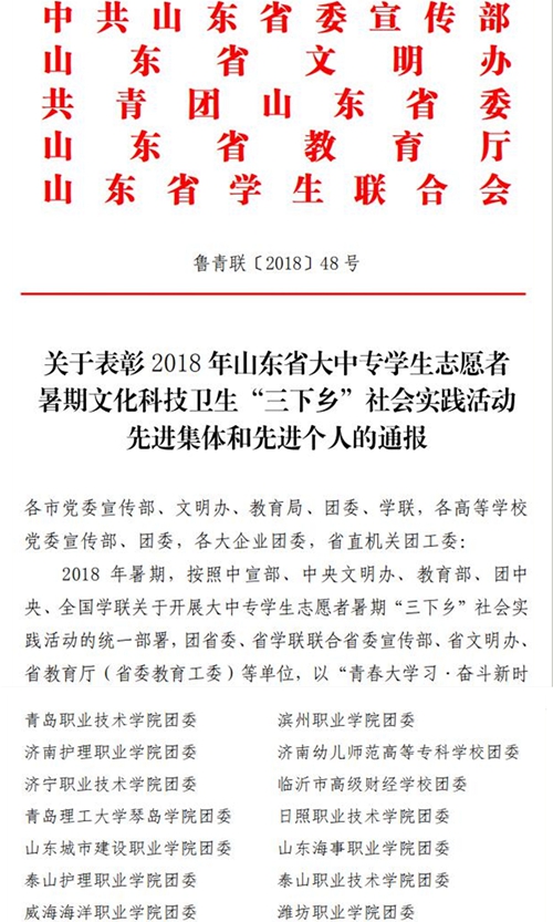 近日,中共山东省委宣传部、省文明办、山东团省委、省教育厅、省学生联合会发布2018年山东省大中专学生志愿者暑期文化科技卫生“三下乡”社会实践活动通报,对在2018年“三下乡”社会实践活动中表现优秀,成绩突出的单位、团队和个人进行了表彰。学院团委再次荣获2018年山东省大中专学生志愿者暑期“三下乡”社会实践活动优秀组织单位称号,16名学生、6名优秀指导教师以及6支团队也分别获得“优秀学生”、“优秀指导教师”和“优秀服务队”等荣誉称号。