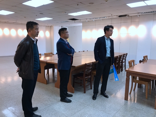 现场考察中,校企双方参观了位于图书馆七楼的人工智能展厅场地,薛玉平介绍了场地前期建设工作的具体情况。孙元强对学院的工作表示感谢,并就展厅的后续布置提出相关建议。