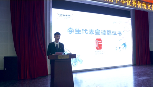 学生代表宣读“仁而爱人,以人为本——做厚德仁爱青职人”倡议书