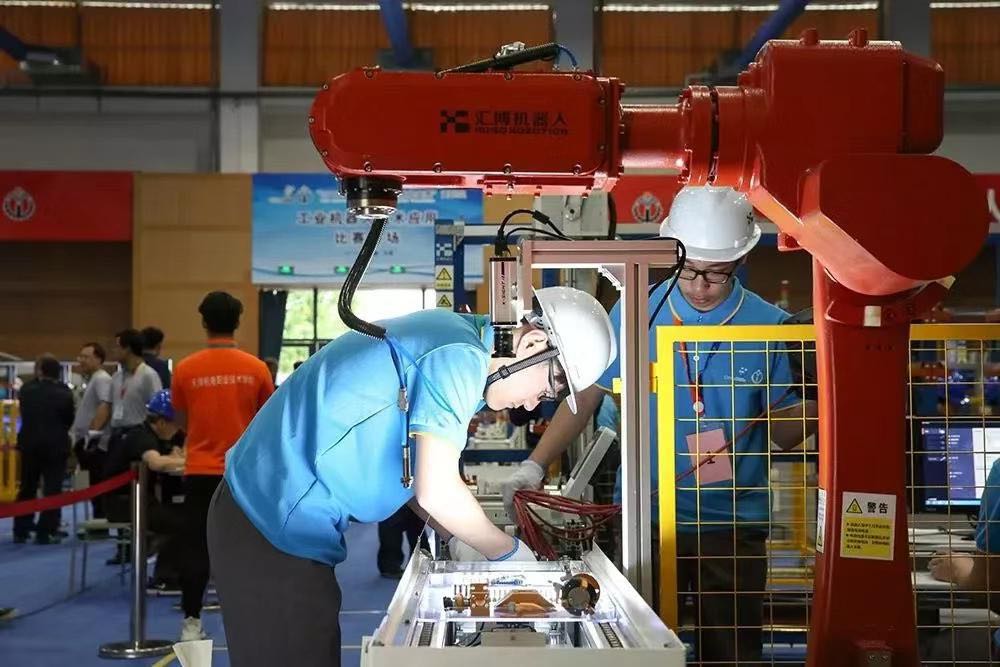 工业机器人技术应用赛项以工业机器人智能工作站系统为竞赛平台,三名参赛选手协作完成工业机器人应用工作站系统中的配套设备机械电气系统的装调、工业机器人标定及示教器示教编程、通讯设置及操作编程、视觉系统编程调试、AGV机器人及码垛机器人的编程调试等基本工作任务,并通过对系统的人机界面开发及控制程序设计等完成工业机器人智能工作站系统的联机运行和特定制造流程等综合任务。共有来自全国30个省、直辖市83所高职院校的249名选手参加了此项比赛。