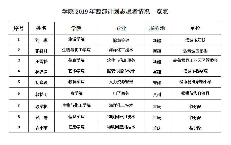 学院2019年西部计划志愿者情况一览表