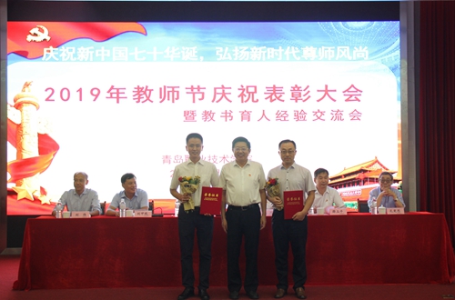 会上,师生全体起立高唱国歌并在“全国技术能手”李元超和“全国大学生心理健康教育工作先进个人”尹海兰的带领下进行集体宣誓。党委副书记刘甲珉宣读了2018-2019学年我院教师所获得的各项荣誉的表彰决定。党委书记王金生为今年获得国字号荣誉的“全国优秀教师”李峰和“全国技术能手”李元超颁发荣誉证书和花束,院领导为获得嘉奖的教师和团队颁发荣誉证书。