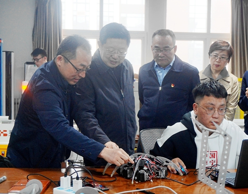王金生参观了实训基地一至五楼“匠心筑梦、科技兴国”主题职业文化建设,视察了智能制造实训工厂、工业机器人应用人才培养中心、全生命周期智能制造实训中心、山东省数控技术职业教育技艺技能传承创新平台等,与基地负责人和教师深入交流,对实训基地建设运行情况、学生实训情况、科研与技术服务、师资队伍建设情况等进行了认真细致的了解。