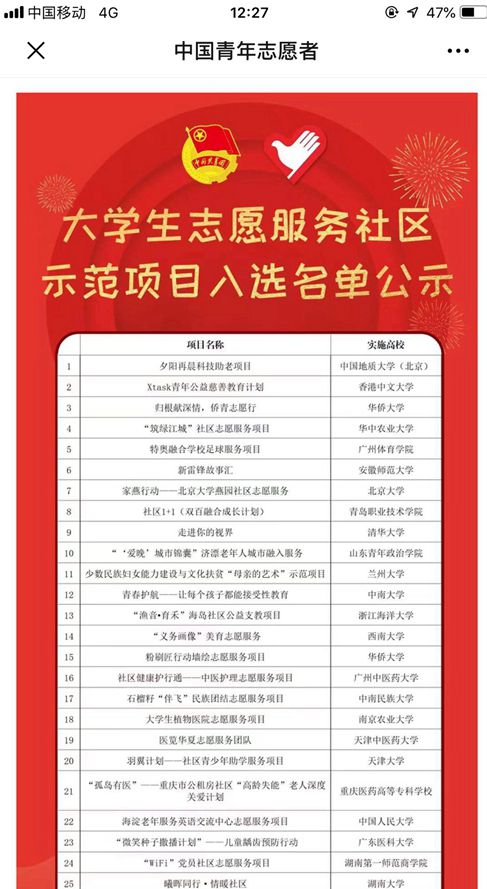 此次活动由团中央青年志愿者行动指导中心、中国青年志愿者协会秘书处主办,面向全国公开遴选。全国各高校共申报项目1160个,854个项目进入集中评审,经专家阅览初评、集中打分等环节,最终确定104个项目入围2019年大学生志愿服务社区示范项目。