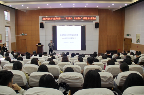 11月13日,学院在报告厅举行“不忘初心、牢记使命”主题教育专题报告会,山东省教育厅办公室调研员、新闻中心主任宋全政研究员应邀作“高校舆情应对与校园传播”主题讲座。院长覃川、党委副书记刘甲珉、纪委书记刘伟出席报告会,全体处级干部、党支部书记、教研室主任、各部门新闻宣传员、舆情信息员、辅导员、新媒体中心指导教师参加报告会。报告会由刘甲珉主持。