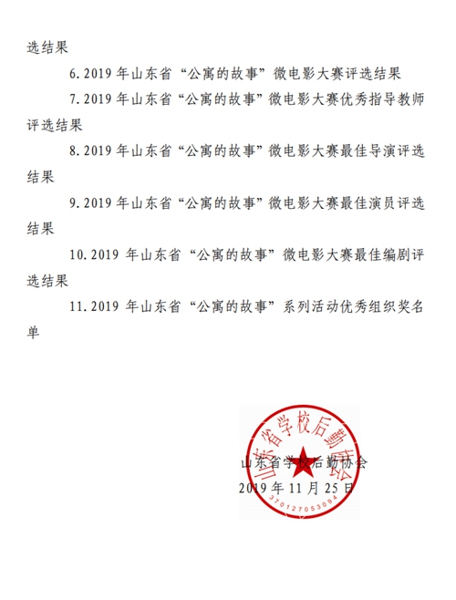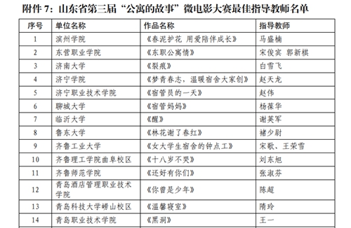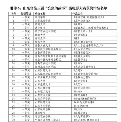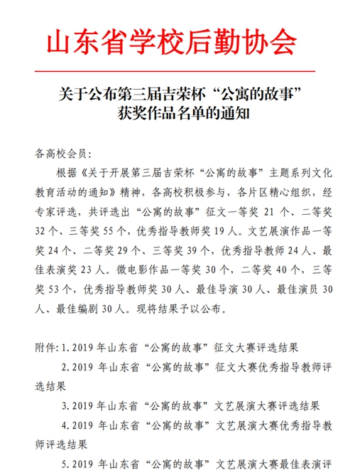 近日,山东省教育厅主管行业协会山东省学校后勤协会公布了山东省高校第三届吉荣杯“公寓的故事”主题系列文化教育活动大赛结果,我院荣获优秀组织奖,同时荣获微电影作品大赛一等奖1项、二等奖1项,最佳指导教师1名,最佳导演1名,最佳演员1名,最佳编剧1名;征文大赛二等奖1项;文艺展演大赛三等奖2项。