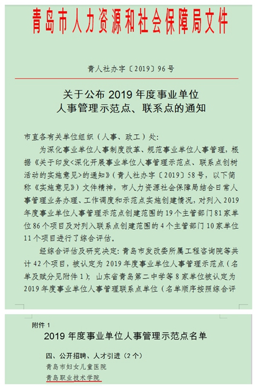 近日,市人社局下发了《关于公布2019年度事业单位人事管理示范点、联系点的通知》,我院从全市列入2019年度事业单位人事管理示范点创建范围的19个主管部门81家单位86个项目的综合评估中,脱颖而出,被评为2019年度青岛市事业单位人事管理示范点。