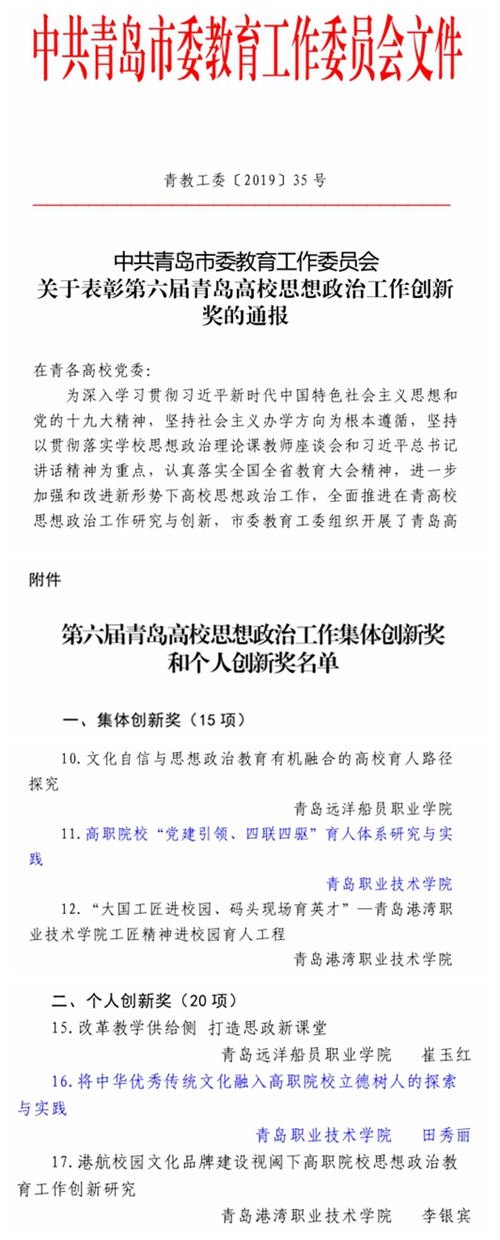 2019年12月30日,青岛市委教育工委发布《关于表彰第六届青岛高校思想政治工作创新奖的通报》(青教工委〔2019〕35号),维多利亚vic003喜获集体创新奖1项,个人创新奖1项。由党委书记王金生主持的项目《高职院校“党建引领、四联四驱”育人体系研究与实践》获集体创新奖,党委宣传部部长田秀丽的《将中华优秀传统文化融入高职院校立德树人的探索与实践》项目获个人创新奖。