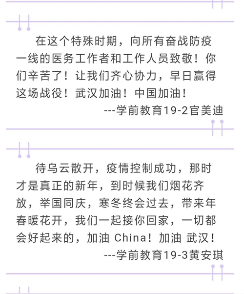语言传递力量,“青职学子”写下真情话语。近日,教育学院组织同学们写出“心中的话”,用自己温暖而有力的话语为武汉加油,为中国加油。同学们积极响应活动号召,以真挚的情感、质朴的话语表达新时代青年学子对打赢这场战“疫”的坚定信心。教育学院还对同学们“心中的话”进行收集整合,并在教育学院官方微信上进行集中展示,以弘扬众志成城的抗“疫”精神,砥砺坚不可摧的抗“疫”斗志,播撒同心抗“疫”的真情。